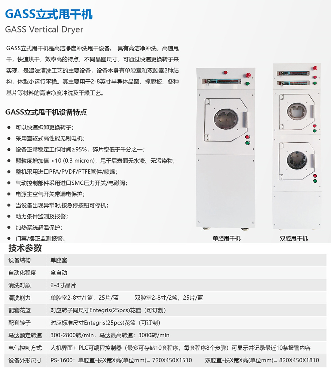 GASS立式甩干機是高潔凈度沖洗甩干設(shè)備,具有高潔凈沖洗,高速甩干,快速烘干,效率高的特點,不同晶圓尺寸,可通過快速更換轉(zhuǎn)子來實現(xiàn)。是濕法清洗工藝的主要設(shè)備,設(shè)備本身有單腔室和雙腔室2種結(jié)構(gòu),體型小運行平穩(wěn)。其主要用于2-8英寸半導(dǎo)體晶圓、掩膜板、各種基片等材料的高潔凈度沖洗及干燥工藝。