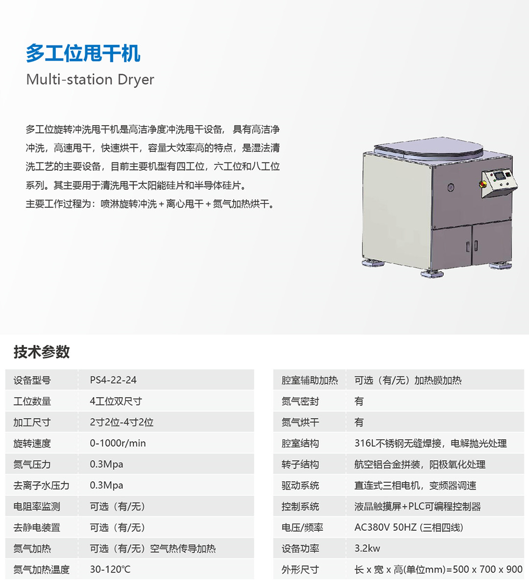 多工位旋轉沖洗甩干機是高潔凈度沖洗甩干設備,具有高潔凈凈沖洗,高速甩干,快速烘干,容量大效率高的特點,是濕法清洗工藝的主要設備,目前主要機型有四工位,六工位和八工位系列。其主要用于清洗甩干太陽能硅片和半導體硅片。