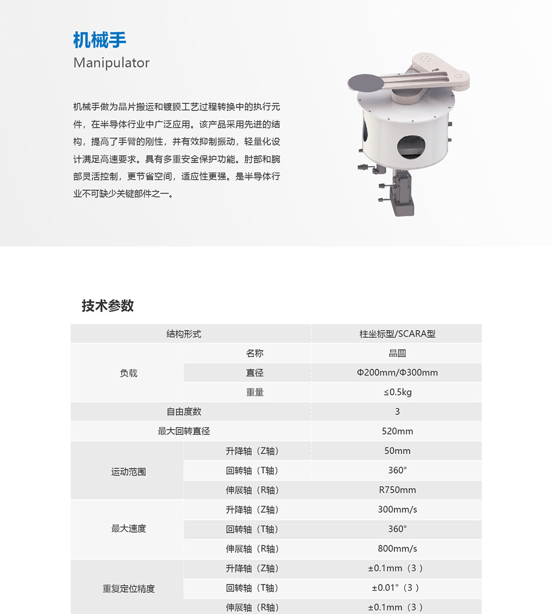 機械手做為晶片搬運和鍍膜工藝過程轉(zhuǎn)換中的執(zhí)行元件,在半導(dǎo)體行業(yè)中廣泛應(yīng)用。